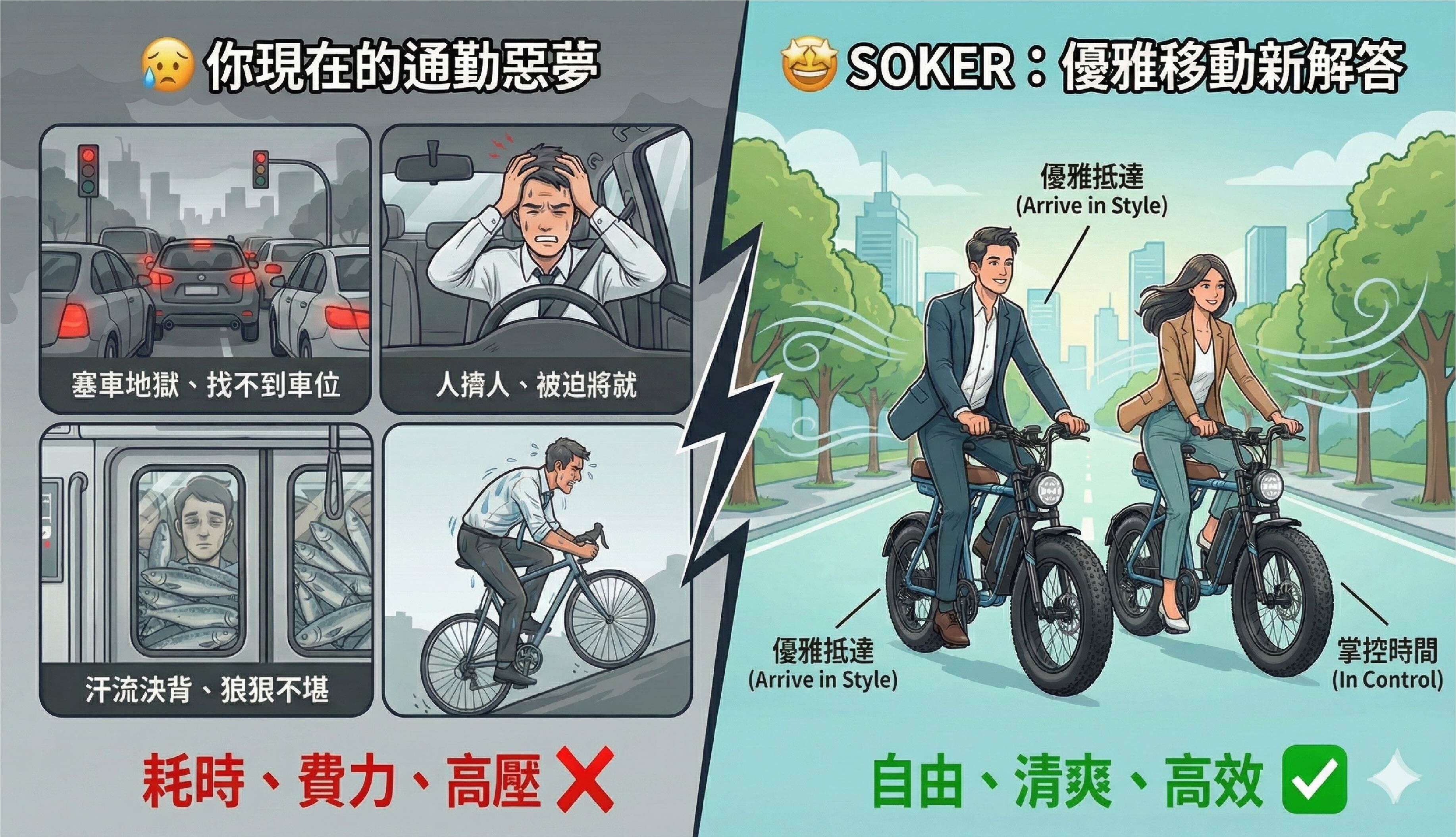 明天早上,陽光正好。你跨上專屬於你的 E-Bike,迎著微風輕鬆踩踏。 你不再是鐵盒子裡焦慮的駕駛,也不是捷運上被擠壓的沙丁魚。 你是享受街道風景的旅人。