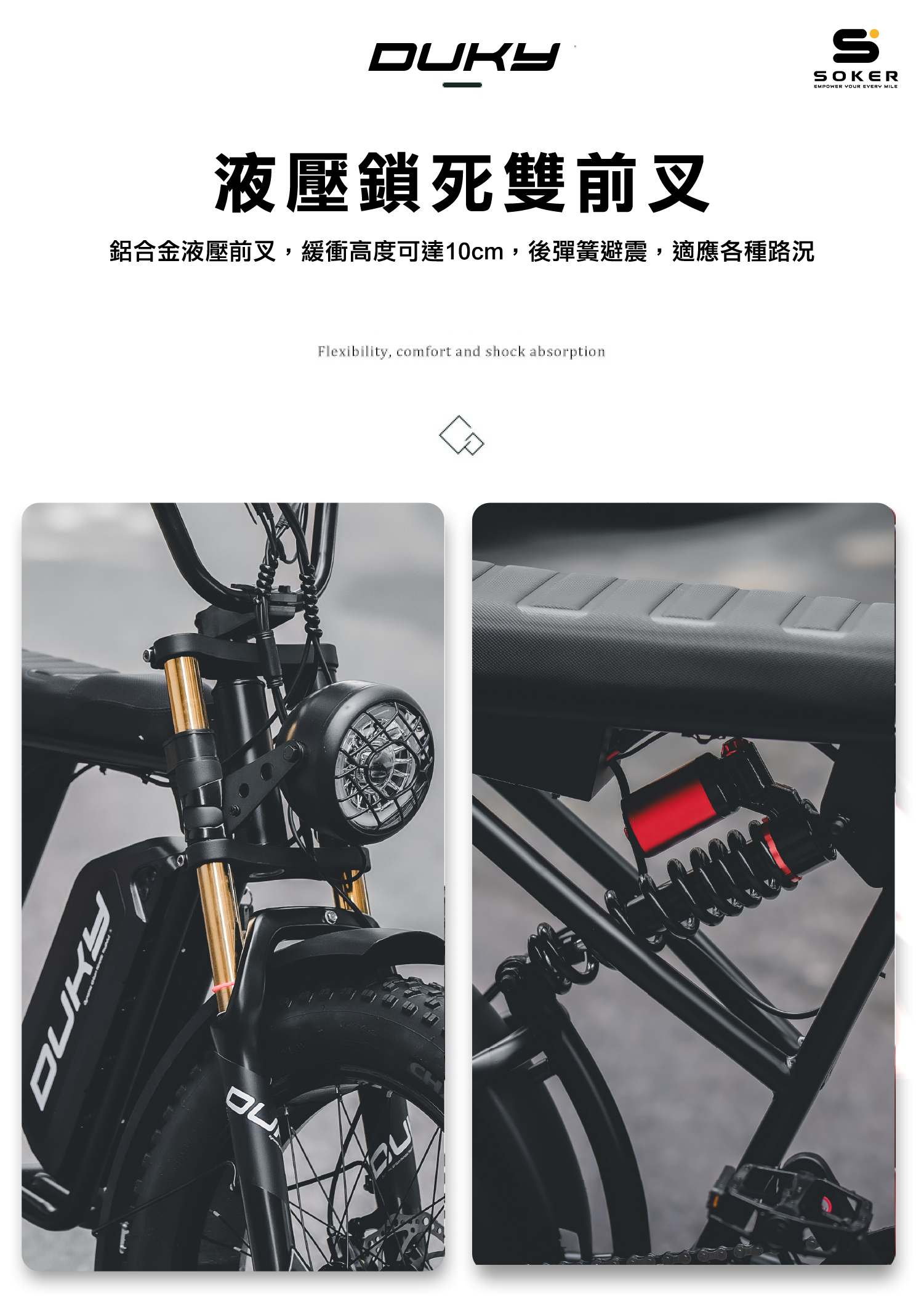 前後避震系統提供穩定舒適的騎行體驗,液壓碟剎保證強力制動。